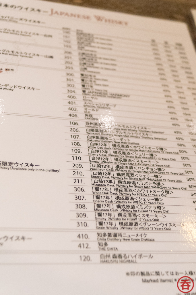 Just in case you’re wondering, the WWA2018 “World’s Best Single Malt” winner Hakushu 25, Yamazaki 25, and Hibiki 30 were all 2900 yen for the sample. Yamazaki 18, Hakushu 18, and Hibiki 21 were all 600 yen. From there down it gets even cheaper!