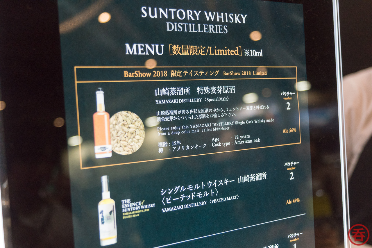 Moving on to the major players, Suntory had a Special Malt version of Yamazaki on hand, with Münchner malt. Also at the booth was the Essence of Suntory series, but I skipped these as I recently had them all at Hakushu. Otherwise, the menu was the standard NAS lineup.