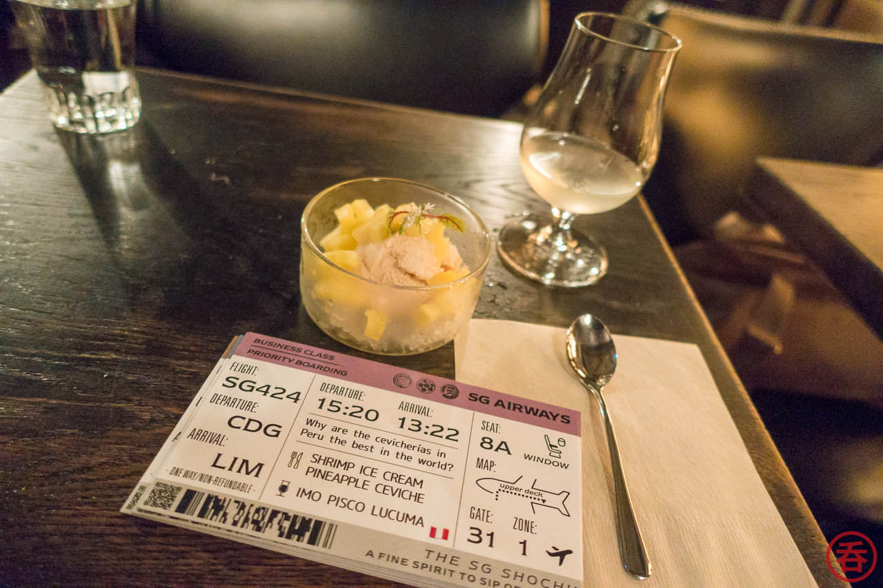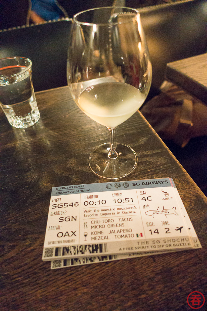 One of the things I whined about when I did the IMO review was the lack of recipes on the official website for what is supposed to be a cocktail-oriented spirit. As we wait for an update to the site that will bring more recipes — which brand manager Joshin Atone tells me is coming — I took them up on the invitation and headed over to Sip at The SG Club.Each course of the “Virtual World Tour” is dedicated to the food and drink of a given country. I won’t spoil the surprise and list all the countries featured, but I will say it’s great to see how versatile The SG Shochu is when matched with the likes of pisco, mezcal, and sherry. Perhaps my favorite drink of the dinner was the combination of MUGI, Cola?, and Champagne. The food is all prepared by chef Atsushi Furukawa, former sous chef at NY’s famed SakaMai. And of course the drinks are made by The SG Club head honcho Shingo Gokan. With a team like that it’s no wonder there’s so much attention to detail.