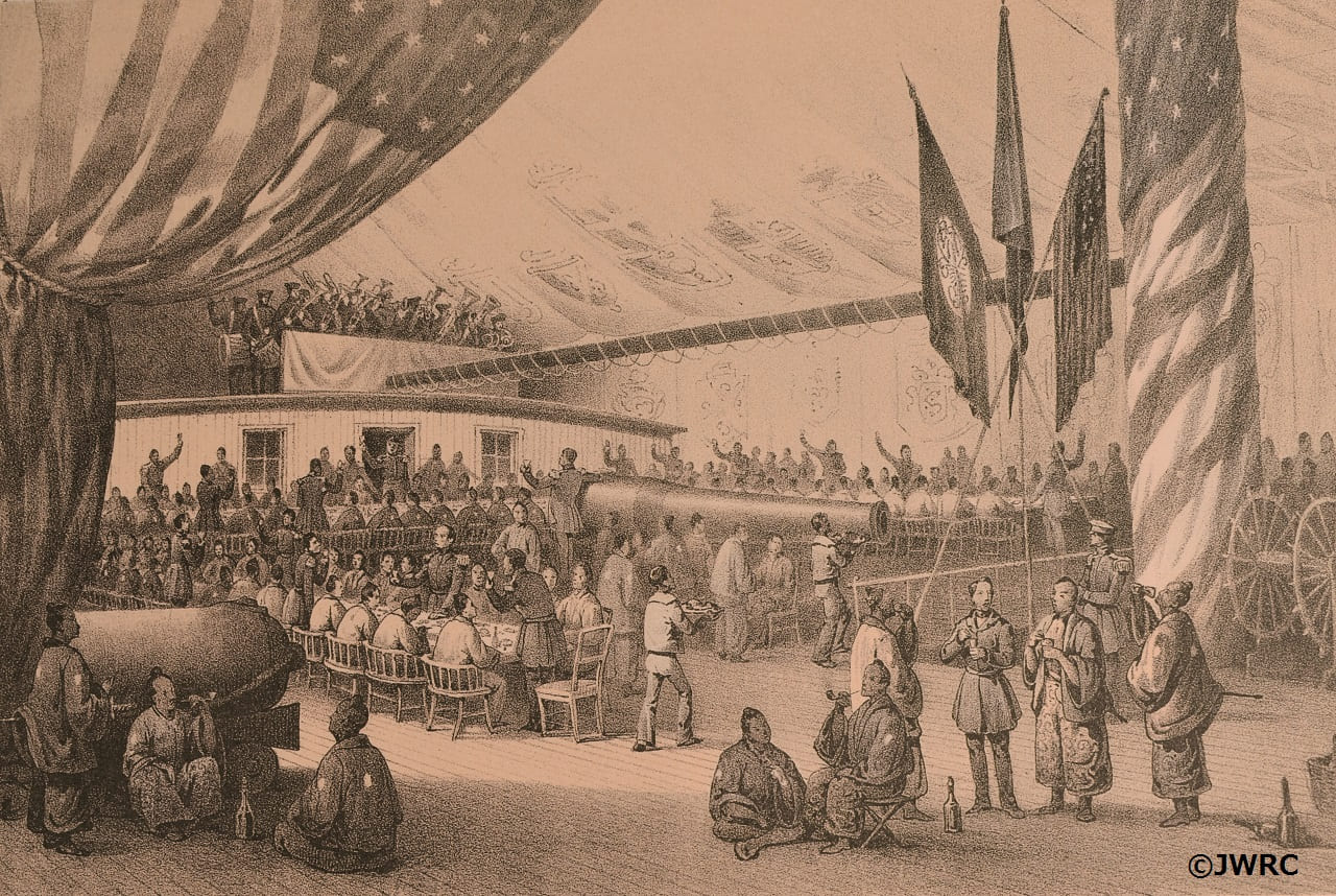 Aiming to open up Japan, Perry’s ships departed the port of Norfolk in November 1852 and arrived in Ryukyu in May 1853. At the time America did not recognize Ryukyu as part of Japan, so they aimed to first sign a treaty with the Kingdom of Ryukyu prior to the doing so with Tokugawa shogunate. Ryukyu records from the time show that the Perry party was warmly welcomed by the Kingdom of Ryukyu, and there is a record of the visitors returning the favor in the form of a party held on the deck of the flagship USS Susquehanna in June 1853. The Ryukyu Kingdom delegacy was treated to all sorts of Western alcohol and delights, including Scotch whisky, American whiskey, wine, port, and punch. The next month, the Perry party arrives in Uraga for negotiations. Invited to the ship was a shogunate delegacy with members such as Tatsunosuke Hori, the shogun’s interpreter, magistrate Saburosuke Nakajima, and Eizaemon Kayama. Whisky was of course served here as well, and the American recordkeeper included a humorous account of their drinking: “Unexpectedly, the Japanese officials enjoyed the John Barleycorn, and disembarked the ship with kimonos stuffed with ham and red faces.”