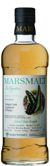 It’s not uncommon for whisky series’ labels to use motifs of life. The former United Distillers, today Diageo, had the famed “Flora & Fauna” series. But nowhere else in the world is there an example of a whisky using insects, especially butterflies. Hombo Shuzo’s “Mars Malt Le Papillon” series–Papillon is French for butterfly–uses only butterflies found in Japan.Launched in February 2017, so far eleven different bottles have been released. As the name Mars Malt indicates, the contents are all malt whiskies from Hombo Shuzo, where entries 1 through 10 were distilled at the Mars Shinshu Distillery. With only two exceptions, they are all single cask, cask strength, natural color bottlings. Entry No. 8 in the series, “A. puspa” was a vatting of two different casks, then had a bit of water added. And entry No. 11, released in May 2021, was not Mars Shinshu single malt but a cask strength vatting of two casks of Mars Tsunuki distillate.
