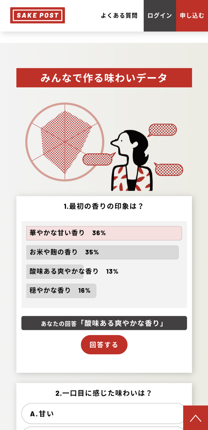 After scanning the QR code, you’re presented with the label and brewery info. Scroll further down and there’s a community section, with Twitter-style polls asking you about the nose, flavor, pairings, and more. Presumably, those poll results are fed back to the brewery. You can also send free-input comments, and even stamps, to the brewery in a separate section of the site. (Please note these shots are from the JP version of the site)