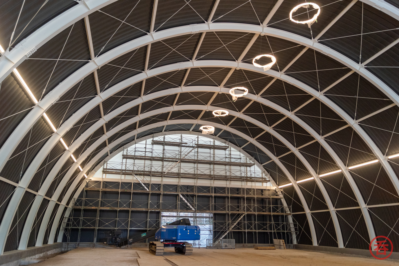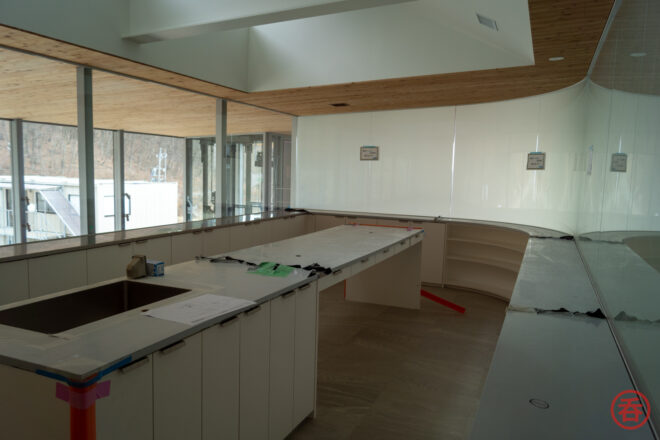 Just up the hill are the distillery’s two dunnage-style warehouses, which resemble hangars. The upper portion of one of the larch facades is–again–glass, making the warehouses feel quite different from what’s typical. Each will house around 3,000 casks. The setup will be palletized, meaning casks will be stacked on their heads rather than on their sides. Palletized warehouses are not seen very often in Japanese whisky.
