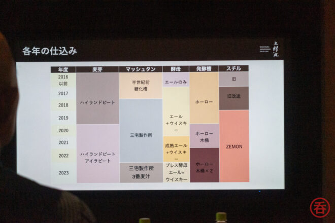 This slide from Inagaki-san’s seminar captures the evolution of the distillery. For malt, in 2020 they added Islay malt to go with the Highland peat they’ve been using since 2016 and earlier. In 2018 they replaced their mash tuns and began taking a 3rd squeeze of wort in 2023. The yeast arsenal has expanded to include pressed/fresh yeast, ales, and whisky yeasts. They added a single wooden mash tun in 2020, and added another in 2022. The stills, of course, switched to Zemon in 2019.