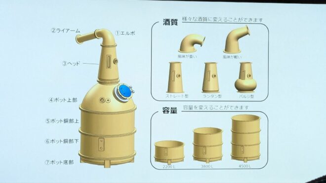 - Those refurbishments were completed in 2017, and in June 2019, the distillery began using the world’s first cast pot stills, dubbed “ZEMON.” Now patented, the stills are an alloy of ~90% copper and ~8% tin. Yup, bronze! Bronze has several advantages over traditional copper pot stills. Tin is the traditional metal for sake cups, and it’s said to make sake more mellow. Using bronze gives the still a rough surface, i.e. more surface area. In a pot still, that means more flavor. For example, furfural, which contributes to sweet caramel-like notes of your distillate, goes from 2.4ppm on a copper still to 19ppm on ZEMON…. a 791% increase. Because ZEMON is cast, it’s also modular — if you want a bigger pot still, you can add more height to the pot portion. The thicker walls and bronze also means ZEMON retains heat far better than thin copper alone. ZEMON can distill 188% more spirit with the same amount of energy a copper still requires.