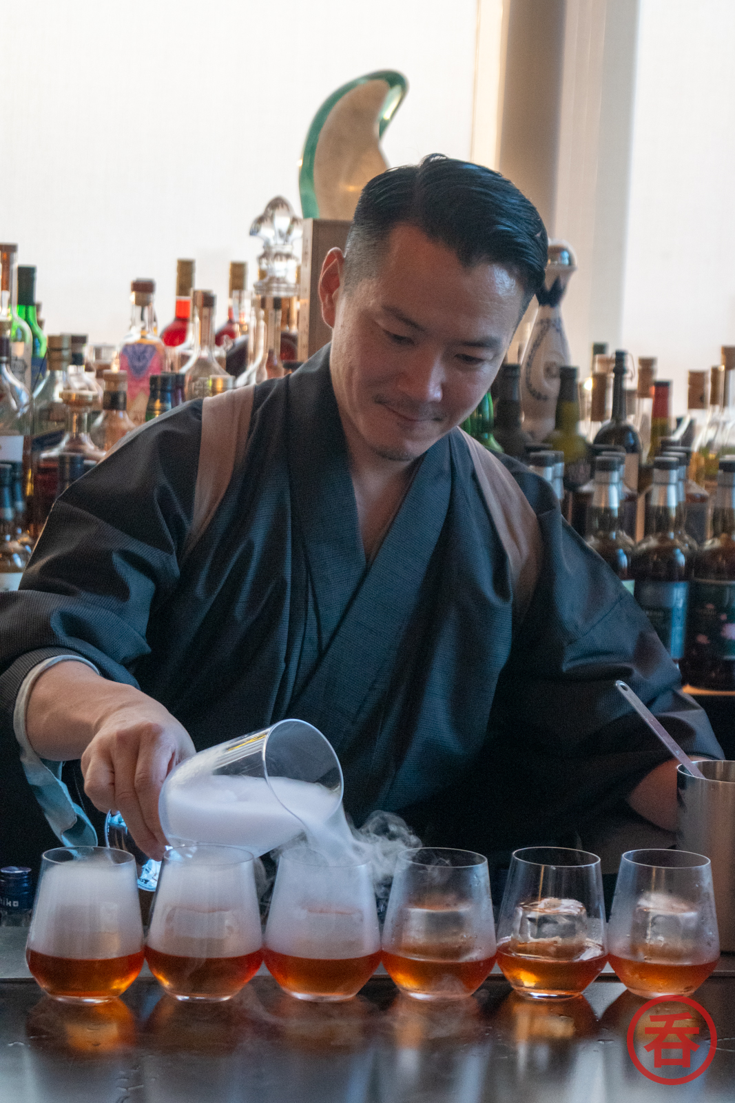 Bincho (備長) basically means “char-grilled,” and Gokan-san uses the name because his cocktail is meant to conjure images of yakitori. Alongisde iichiko Saiten and Campari, it has passion fruit and char-grilled schmaltz: not a typical cocktail ingredient. He uses a smoker to present it as well, further building the yakitori theme.