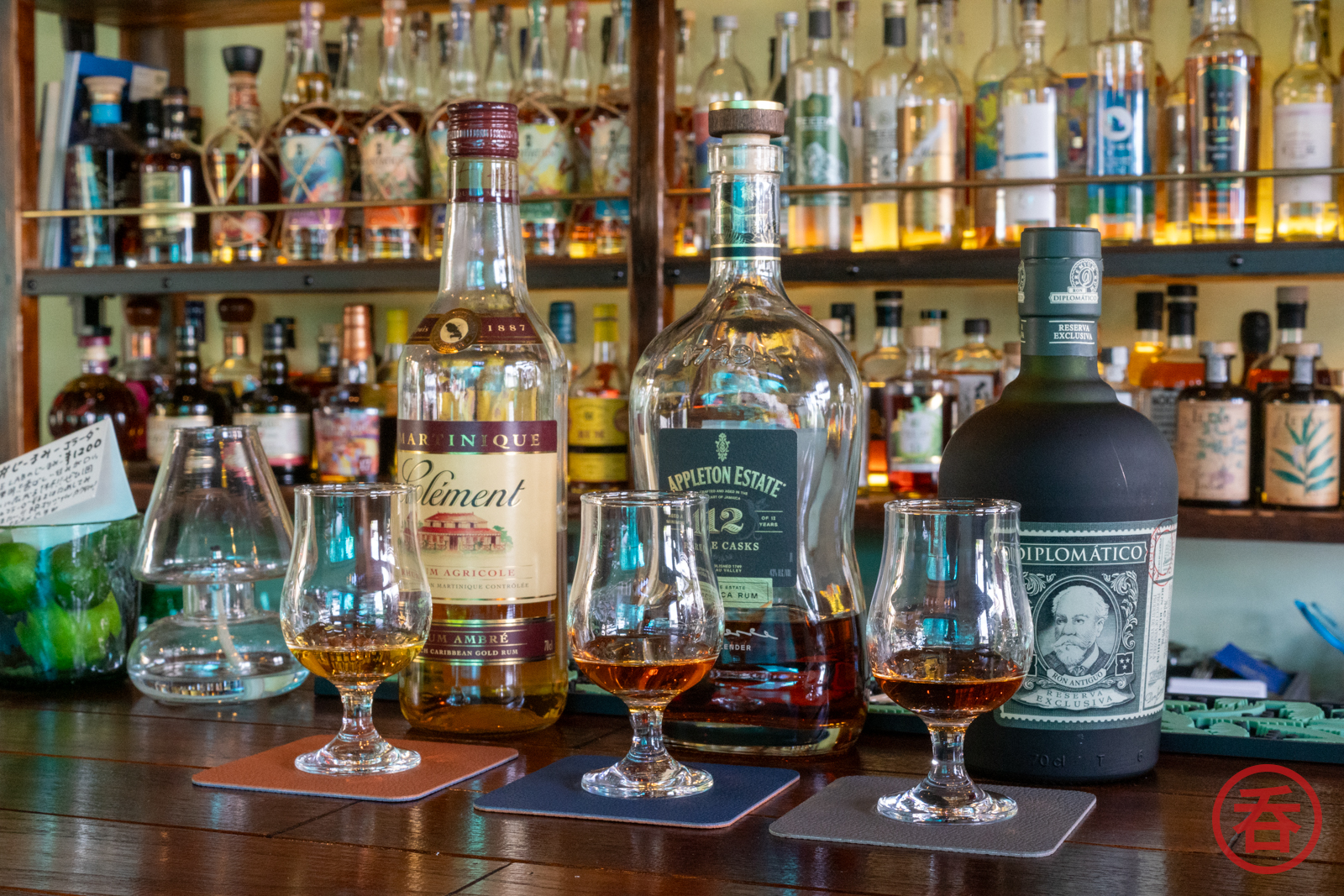 I honestly don’t know where to start with describing the rum. The backbar has two entire shelves devoted to Ebisawa-san’s private bottlings in the SINOB series, for example. 12-year single cask from Belize, a Caroni 1997 right next to a 22-year Caroni, Venezuelan aged for 12 years in Venezuela, then 2 years in the UK. And that’s just the private bottlings.